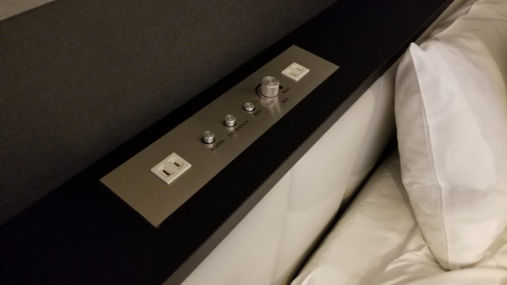 ベッドの枕元には照明のボタンと調光機、コンセントが2口あります。