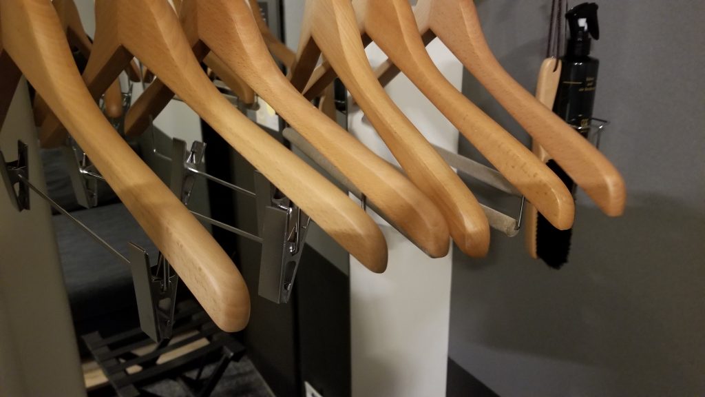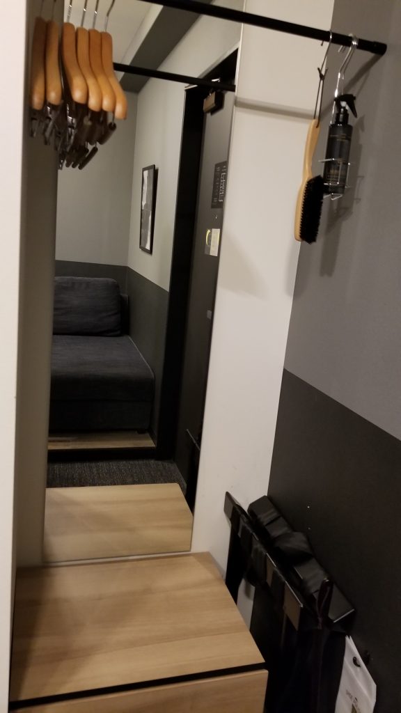ハンガーはパンツを吊るすことが出来るタイプが2本と滑り止めがついているハンガーが4本あります。(ツインルームのお部屋の場合)あと、靴を磨くブラシと無臭の消臭スプレーが備え付けてあります。