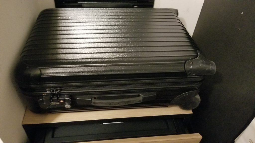 RIMOWAの機内持ち込みタイプのキャリーはハンガー下の台の上に置くことが出来ます。