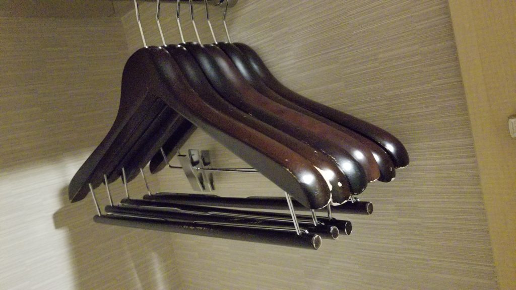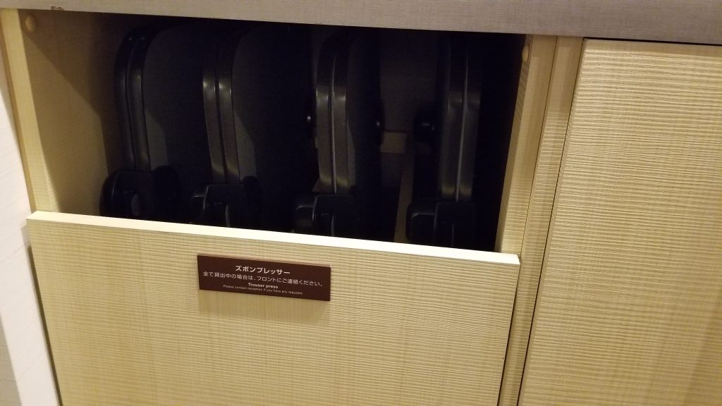 エレベーターホールにはズボンプレッサーがあります、共用なので朝はなくなっていることが多いですので、夜のうちに使うのがオススメです。
