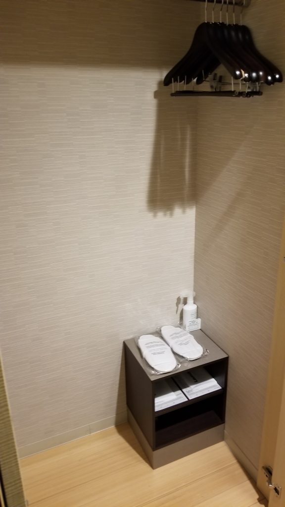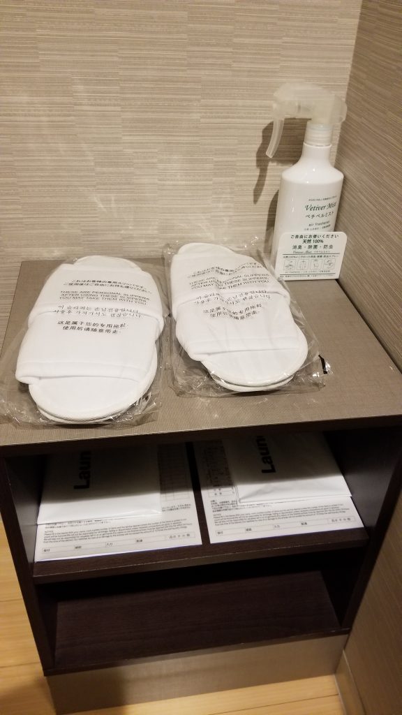 右側には、スリッパと無香料の消臭剤、棚の中にはランドリー用の袋があります。