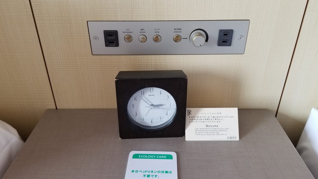 ベットの間にはコンセントと照明のオンオフボタンと調光を調節できるレバーがあり、ベッドに入ってからでも照明を消すことが出来ます。