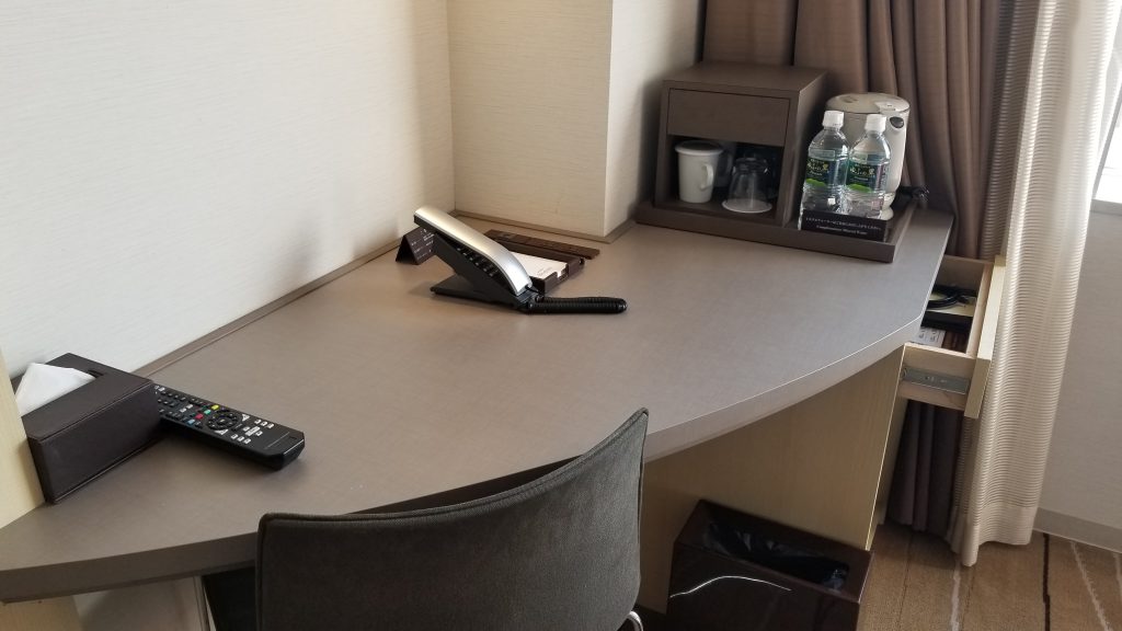 お部屋には写真のデスクがあり、パソコンと資料を広げて作業をすることが出来ます。写真で見るよりスペースは広く感じます。