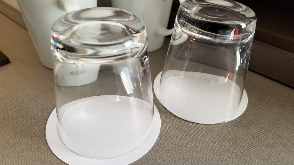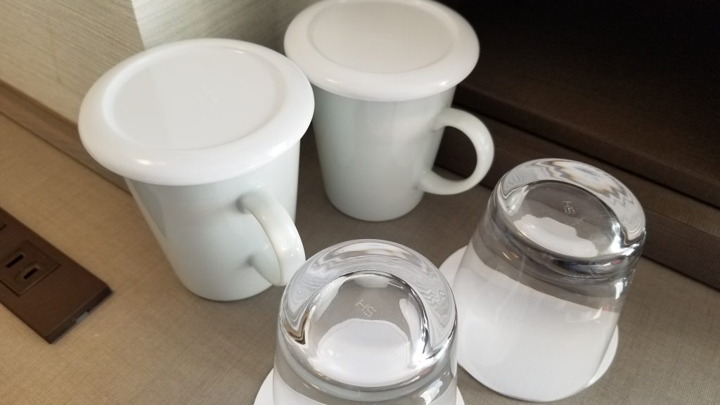 デスクの右手にはサービスのミネラルウォーターとコップが宿泊人数分あります。