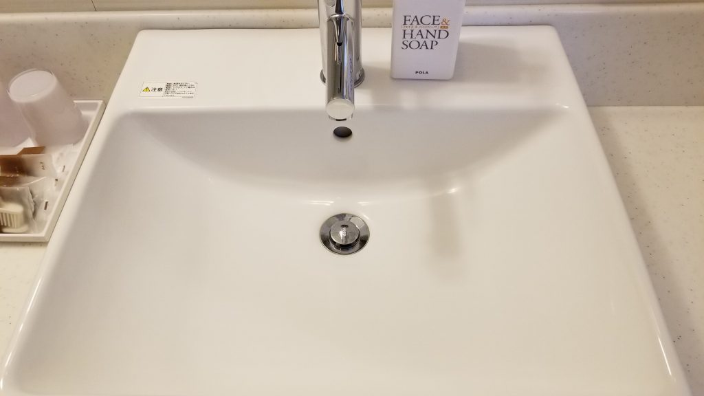 大きな洗面台と充実したアメニティも充実しており、洗面台の左手にはトイレのボタンとドライヤーがあります。